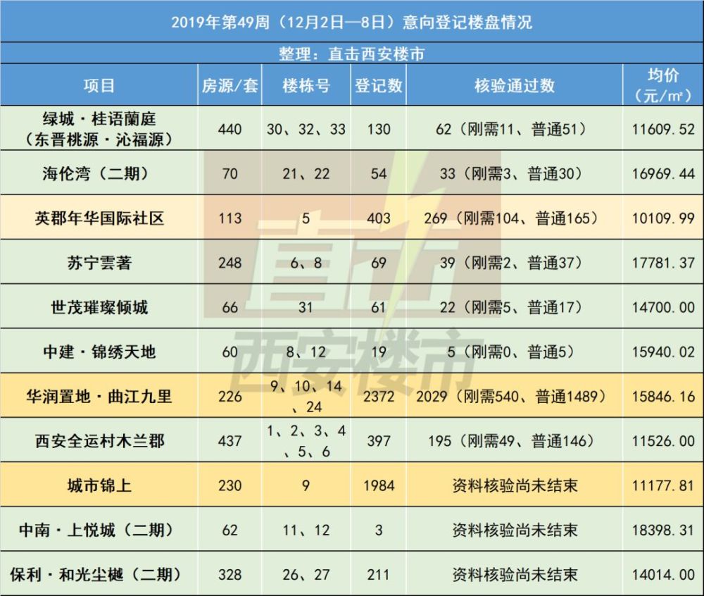 上星期(2019年第49周;12月2日—8日),西安市共有11盘进行意向挂号,共推出房源2280套。