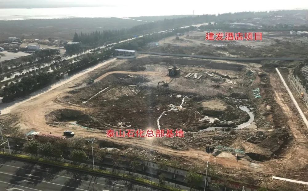 而与泰山石化总部基地相邻的东海悦华酒店暂未发动建造,2019年8月17日厦门建发旅行集团股份有限公司以4840万元底价竞得该地块。与东海悦华酒店一路之隔的荣誉世界广场地下室建造中。