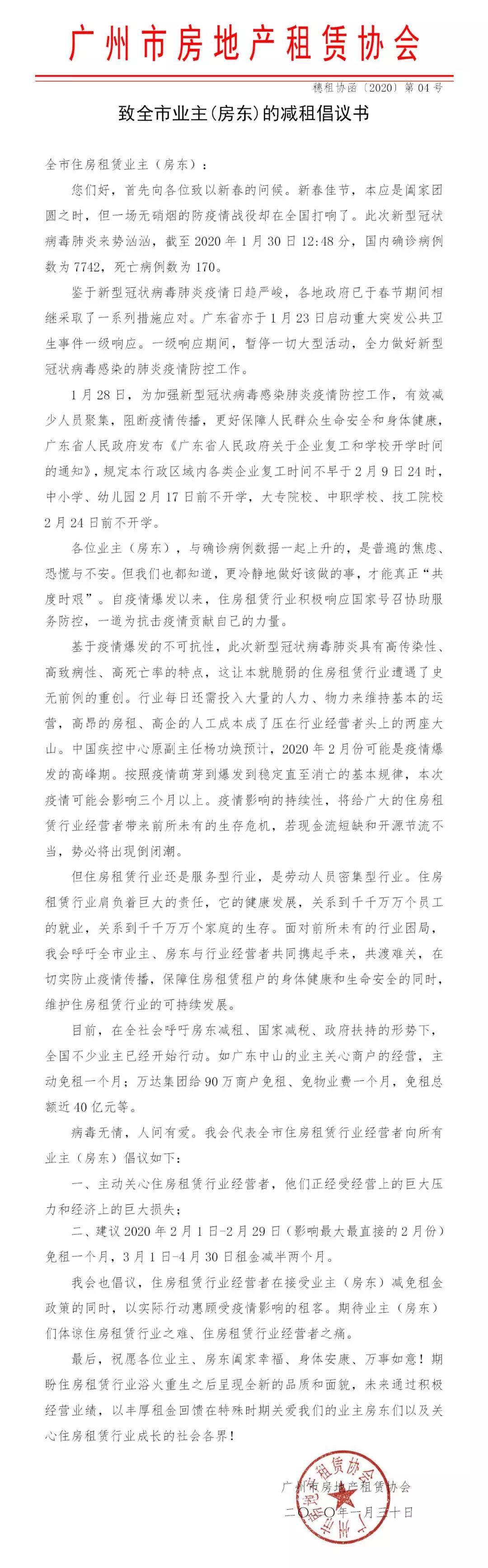 1月30日,广东省广州市住宅租借职业协会发布《致全市业主(房东)的减租倡议书》,《倡议书》称,协会代表全市一切住宅租借职业运营业主向房东召唤自动减租。