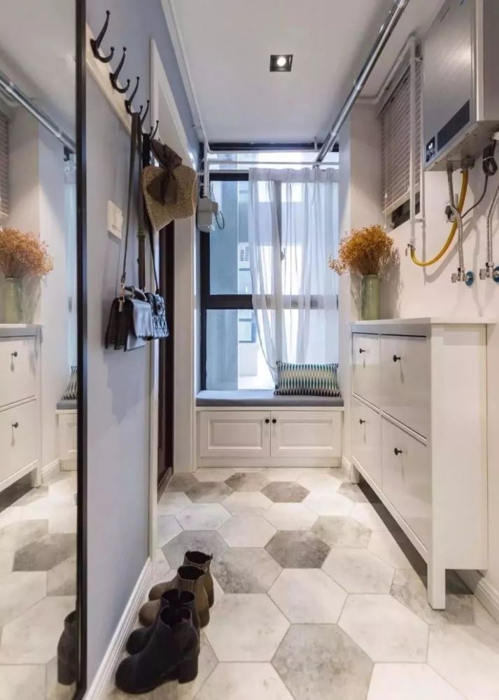 你还能够现在把换鞋凳和鞋柜结合在一起,只需要1㎡的空间即可,平常咱们替换的鞋子有这么一个小空间足以。